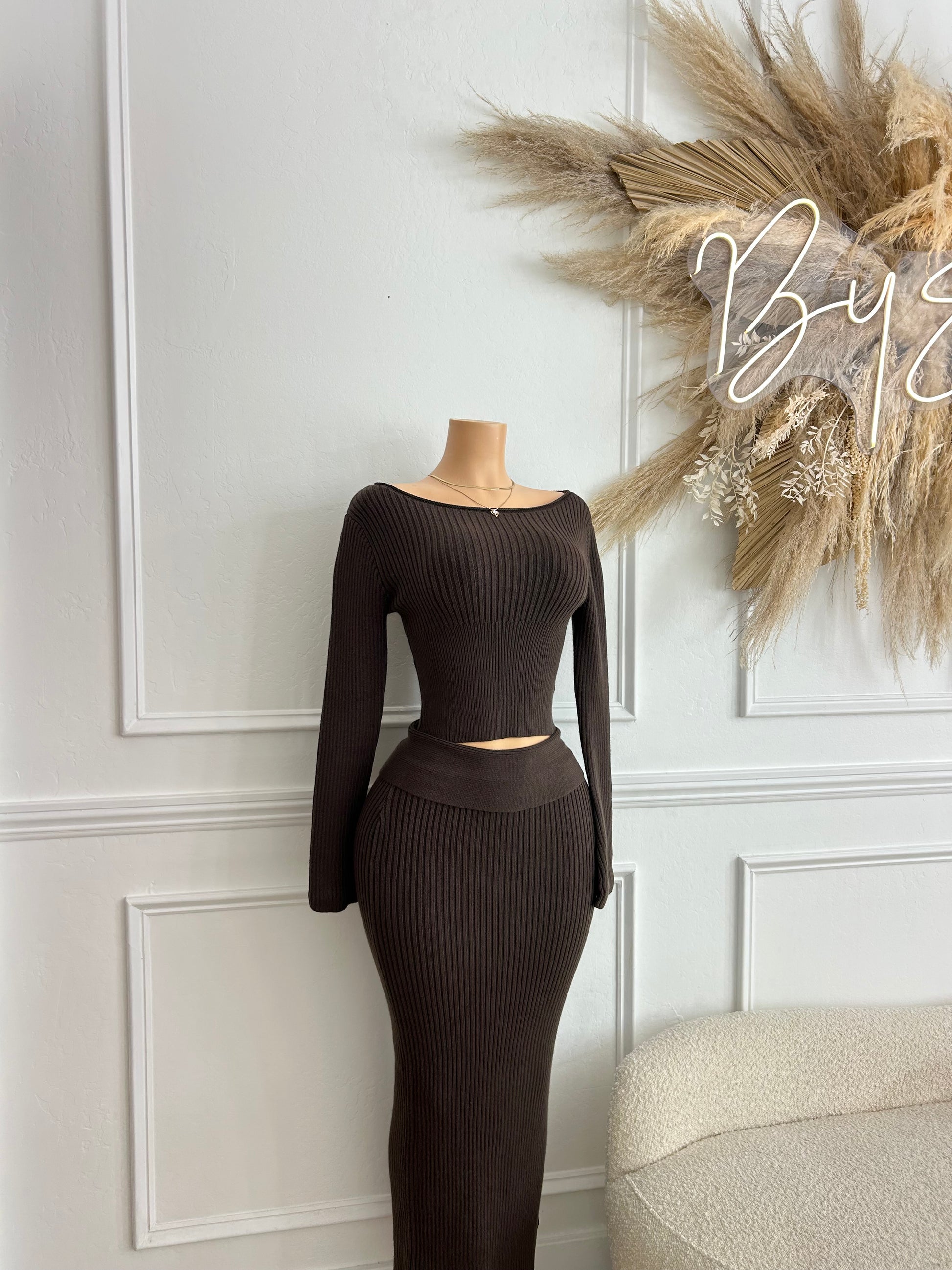 Brown ribbed two pc maxi skirt set